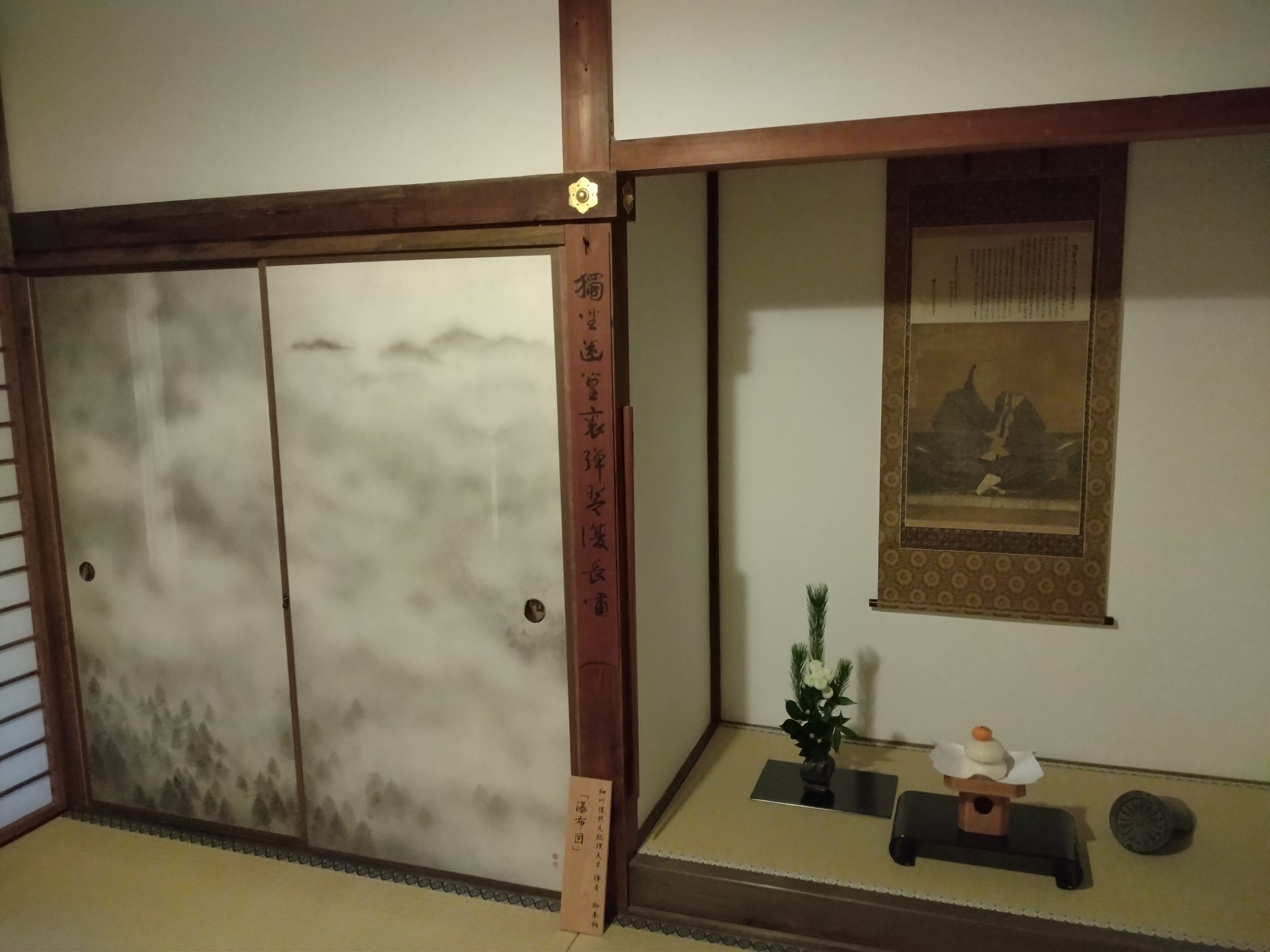 画像は、細川護熙元総理大臣揮毫・御奉納の襖絵「瀑布図」、掛け軸は当山開基・細川頼之公肖像画です。1月中のみ公開。