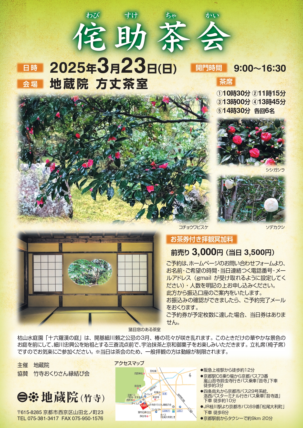地蔵院では、30年前までは、前住職寺庭主催の茶会(表千家)を毎年催していました。前住職寺庭が高齢でとりやめとなり、およそ8年前に、細川忠興公を始祖とする三斎流宗匠とご縁があり、三斎流にて、茶会を再開しました。その後コロナ禍となって再び茶会を休止。今回、宗匠のご厚意で、6年ぶりに茶会を催すはこびとなりました。また、今回は、京都観光のおついでにも参加していただきやすいように、立礼席といたしましたので、御扇子や懐紙をお持ちでなくても、気楽にご参加くださいませ。