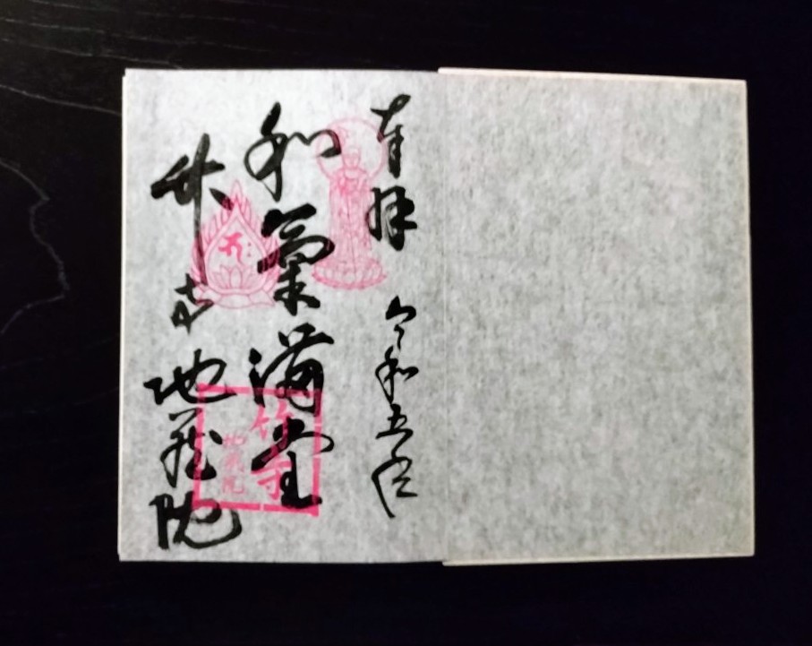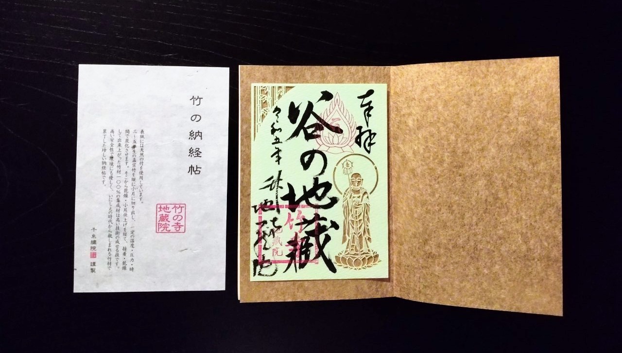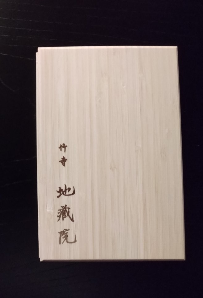 地蔵院で一番人気の竹でできているご朱印帖に、このたび、限定数8個だけ、表面が金色・裏面が銀色になっているご朱印帖を作ってもらいました。表金色面には、ご本尊地蔵菩薩様切り絵ご朱印(800円)を貼り、裏銀色面には直書き(500円)してあります。二体のご朱印と竹製ご朱印帖と共で、冥加料は4000円です。